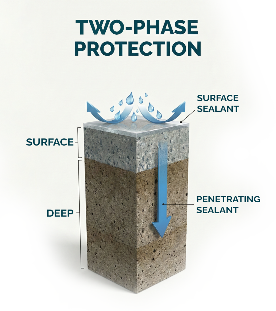 From penetrating silane–siloxane sealers to durable topical coatings, we rely on science-backed solutions and an education-first approach to extend the life and appearance of every concrete surface we treat.